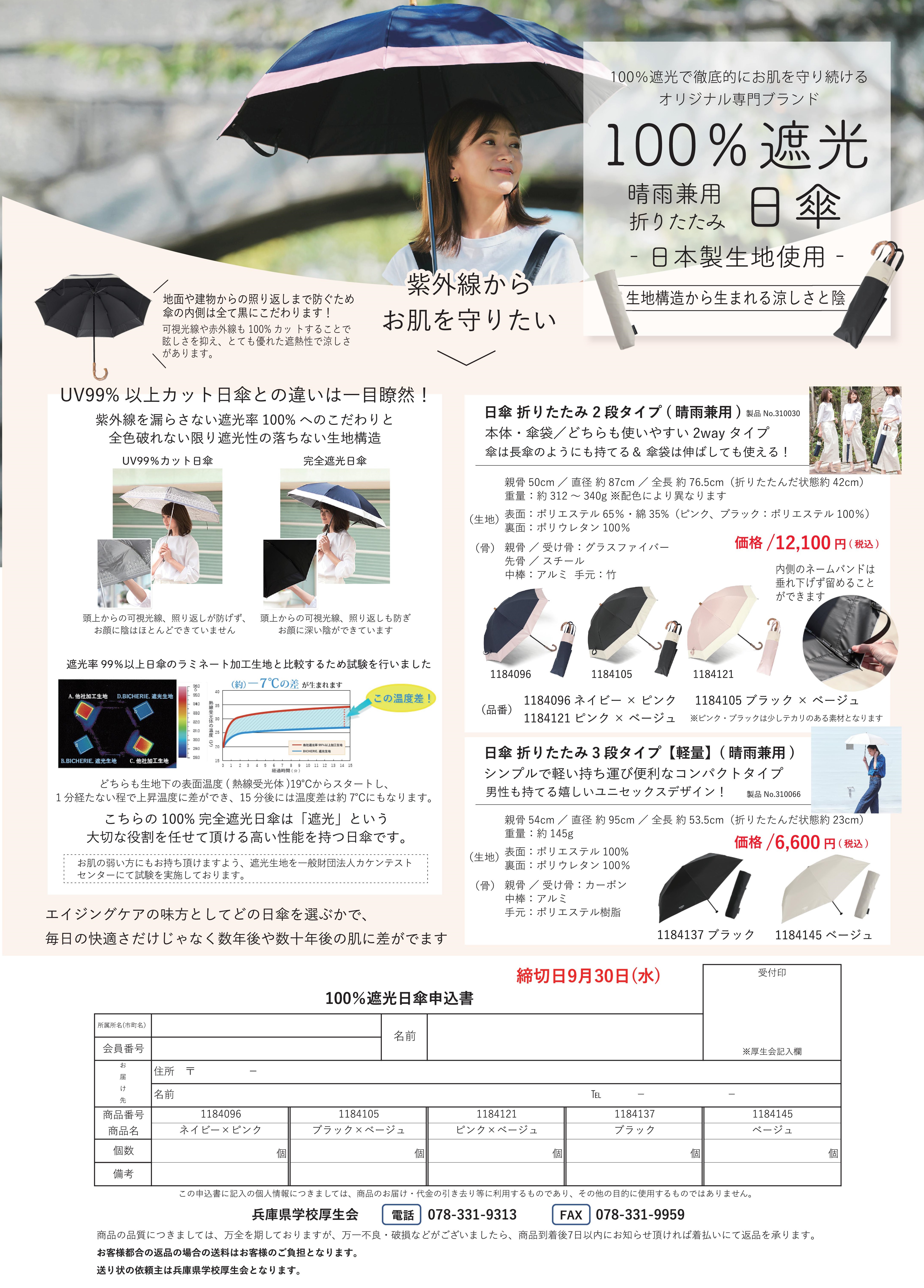 | 晴雨兼用折りたたみ100%遮光日傘 ネイビー×ピンク ・ ブラック×ベージュ ・ ピンク×ベージュ |